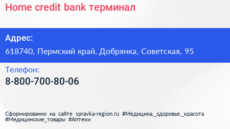 Home credit bank, терминал по адресу 618740, Пермский край, Добрянка, Советская, 95 в дальнейшем Организация, размещена в следующих категориях: