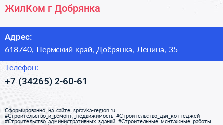 ЖилКом, г. Добрянка по адресу 618740, Пермский край, Добрянка, Ленина, 35 в дальнейшем Организация, размещена в следующих категориях: