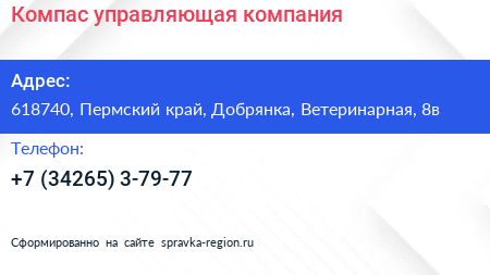 Компас, управляющая компания по адресу 618740, Пермский край, Добрянка, Ветеринарная, 8в в дальнейшем Организация, размещена в следующих категориях: