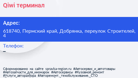 Qiwi, терминал по адресу 618740, Пермский край, Добрянка, переулок Строителей, 4 в дальнейшем Организация, размещена в следующих категориях: