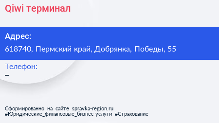 Qiwi, терминал по адресу 618740, Пермский край, Добрянка, Победы, 55 в дальнейшем Организация, размещена в следующих категориях:
