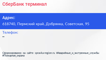 СберБанк, терминал по адресу 618740, Пермский край, Добрянка, Советская, 95 в дальнейшем Организация, размещена в следующих категориях: