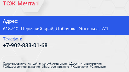 ТСЖ Мечта-1 по адресу 618740, Пермский край, Добрянка, Энгельса, 7/1 в дальнейшем Организация, размещена в следующих категориях: