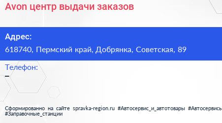 Avon, центр выдачи заказов по адресу 618740, Пермский край, Добрянка, Советская, 89 в дальнейшем Организация, размещена в следующих категориях: