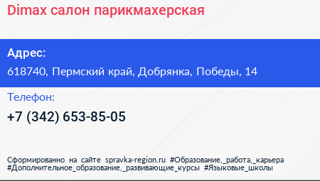 Dimax, салон-парикмахерская по адресу 618740, Пермский край, Добрянка, Победы, 14 в дальнейшем Организация, размещена в следующих категориях: