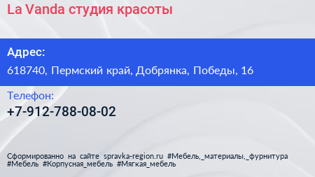La Vanda, студия красоты по адресу 618740, Пермский край, Добрянка, Победы, 16 в дальнейшем Организация, размещена в следующих категориях: