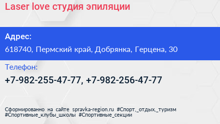 Laser love, студия эпиляции по адресу 618740, Пермский край, Добрянка, Герцена, 30 в дальнейшем Организация, размещена в следующих категориях: