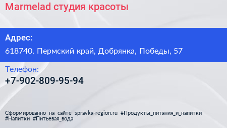 Marmelad, студия красоты по адресу 618740, Пермский край, Добрянка, Победы, 57 в дальнейшем Организация, размещена в следующих категориях: