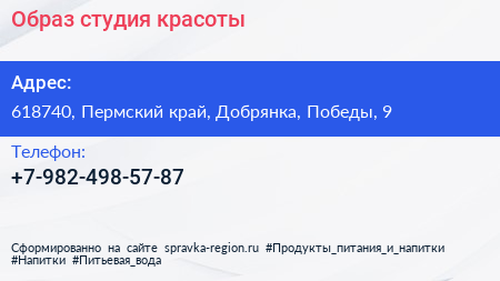 Образ, студия красоты по адресу 618740, Пермский край, Добрянка, Победы, 9 в дальнейшем Организация, размещена в следующих категориях: