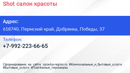 Shot, салон красоты по адресу 618740, Пермский край, Добрянка, Победы, 37 в дальнейшем Организация, размещена в следующих категориях: