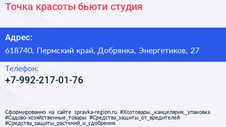 Точка красоты, бьюти-студия по адресу 618740, Пермский край, Добрянка, Энергетиков, 27 в дальнейшем Организация, размещена в следующих категориях: