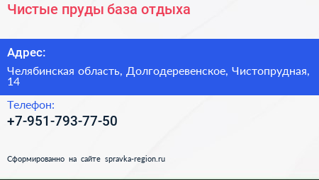 Чистые пруды, база отдыха по адресу Челябинская область, Долгодеревенское, Чистопрудная, 14 в дальнейшем Организация, размещена в следующих категориях: