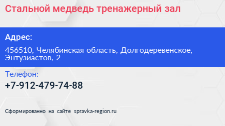 Стальной медведь, тренажерный зал по адресу 456510, Челябинская область, Долгодеревенское, Энтузиастов, 2 в дальнейшем Организация, размещена в следующих категориях: