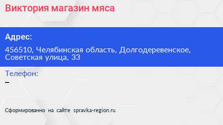 Виктория, магазин мяса по адресу 456510, Челябинская область, Долгодеревенское, Советская улица, 33 в дальнейшем Организация, размещена в следующих категориях: