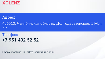 XOLENZ по адресу 456510, Челябинская область, Долгодеревенское, 1 Мая, 2Б в дальнейшем Организация, размещена в следующих категориях: