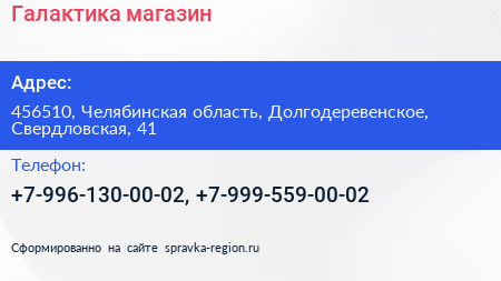Галактика, магазин по адресу 456510, Челябинская область, Долгодеревенское, Свердловская, 41 в дальнейшем Организация, размещена в следующих категориях: