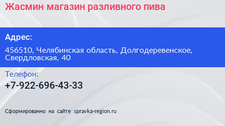 Жасмин, магазин разливного пива по адресу 456510, Челябинская область, Долгодеревенское, Свердловская, 40 в дальнейшем Организация, размещена в следующих категориях: