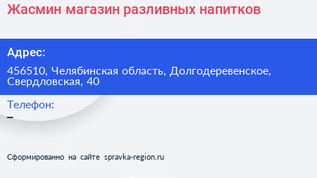 Жасмин, магазин разливных напитков по адресу 456510, Челябинская область, Долгодеревенское, Свердловская, 40 в дальнейшем Организация, размещена в следующих категориях: