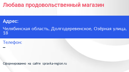 Любава, продовольственный магазин по адресу Челябинская область, Долгодеревенское, Озёрная улица, 18 в дальнейшем Организация, размещена в следующих категориях: