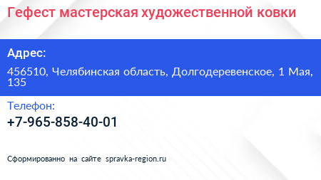 Гефест, мастерская художественной ковки по адресу 456510, Челябинская область, Долгодеревенское, 1 Мая, 135 в дальнейшем Организация, размещена в следующих категориях: