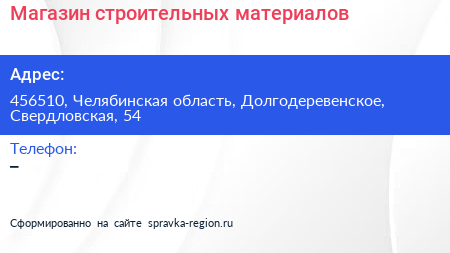 Магазин строительных материалов по адресу 456510, Челябинская область, Долгодеревенское, Свердловская, 54 в дальнейшем Организация, размещена в следующих категориях: