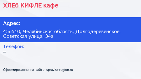 ХЛЕб & КИФЛЕ, кафе по адресу 456510, Челябинская область, Долгодеревенское, Советская улица, 34а в дальнейшем Организация, размещена в следующих категориях: