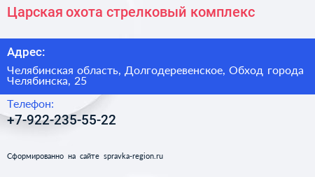 Царская охота, стрелковый комплекс по адресу Челябинская область, Долгодеревенское, Обход города Челябинска, 25 в дальнейшем Организация, размещена в следующих категориях: