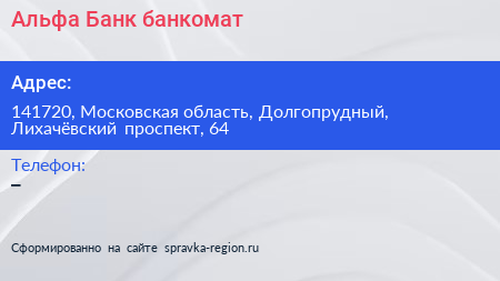 Альфа-Банк, банкомат по адресу 141720, Московская область, Долгопрудный, Лихачёвский проспект, 64 в дальнейшем Организация, размещена в следующих категориях: