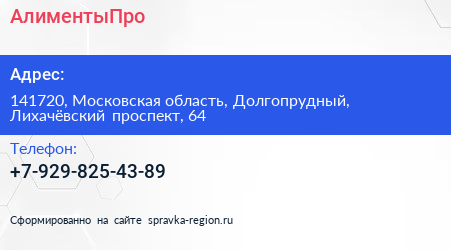 АлиментыПро по адресу 141720, Московская область, Долгопрудный, Лихачёвский проспект, 64 в дальнейшем Организация, размещена в следующих категориях: