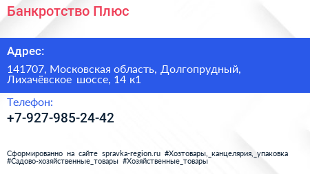 Банкротство Плюс по адресу 141707, Московская область, Долгопрудный, Лихачёвское шоссе, 14 к1 в дальнейшем Организация, размещена в следующих категориях: