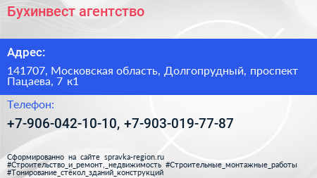 Бухинвест, агентство по адресу 141707, Московская область, Долгопрудный, проспект Пацаева, 7 к1 в дальнейшем Организация, размещена в следующих категориях: