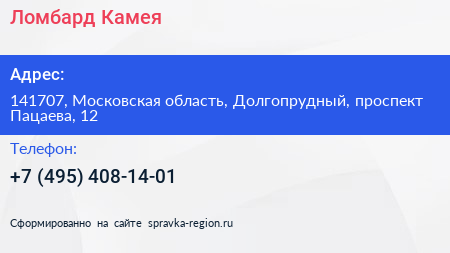 Ломбард Камея по адресу 141707, Московская область, Долгопрудный, проспект Пацаева, 12 в дальнейшем Организация, размещена в следующих категориях: