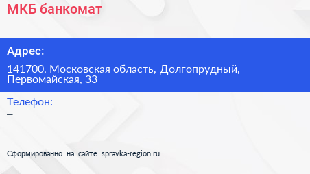 МКБ, банкомат по адресу 141700, Московская область, Долгопрудный, Первомайская, 33 в дальнейшем Организация, размещена в следующих категориях: