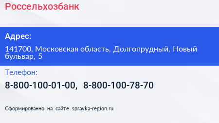 Россельхозбанк по адресу 141700, Московская область, Долгопрудный, Новый бульвар, 5 в дальнейшем Организация, размещена в следующих категориях: