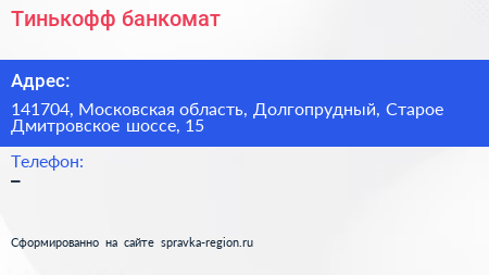 Тинькофф, банкомат по адресу 141704, Московская область, Долгопрудный, Старое Дмитровское шоссе, 15 в дальнейшем Организация, размещена в следующих категориях: