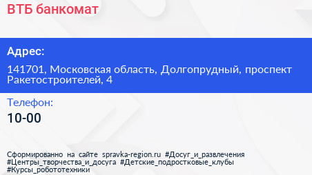 ВТБ, банкомат по адресу 141701, Московская область, Долгопрудный, проспект Ракетостроителей, 4 в дальнейшем Организация, размещена в следующих категориях: