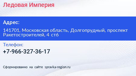Ледовая Империя по адресу 141701, Московская область, Долгопрудный, проспект Ракетостроителей, 4 ст6 в дальнейшем Организация, размещена в следующих категориях: