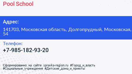 Pool School по адресу 141703, Московская область, Долгопрудный, Московская, 54 в дальнейшем Организация, размещена в следующих категориях: