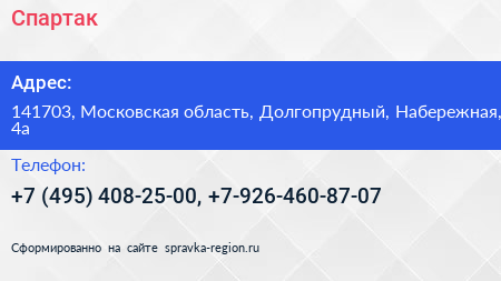 Спартак по адресу 141703, Московская область, Долгопрудный, Набережная, 4а в дальнейшем Организация, размещена в следующих категориях: