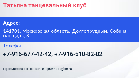 Татьяна, танцевальный клуб по адресу 141701, Московская область, Долгопрудный, Собина площадь, 3 в дальнейшем Организация, размещена в следующих категориях: