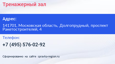 Тренажерный зал по адресу 141701, Московская область, Долгопрудный, проспект Ракетостроителей, 4 в дальнейшем Организация, размещена в следующих категориях:
