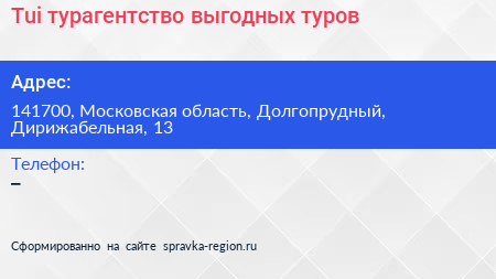 Tui, турагентство выгодных туров по адресу 141700, Московская область, Долгопрудный, Дирижабельная, 13 в дальнейшем Организация, размещена в следующих категориях: