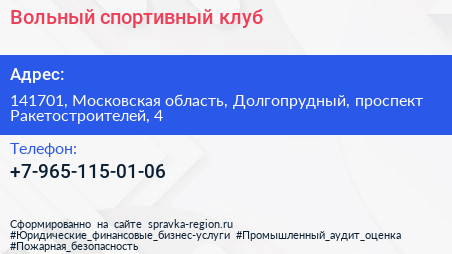 Вольный, спортивный клуб по адресу 141701, Московская область, Долгопрудный, проспект Ракетостроителей, 4 в дальнейшем Организация, размещена в следующих категориях: