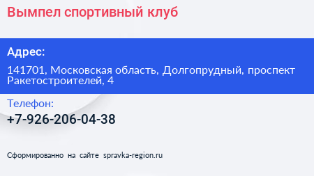 Вымпел, спортивный клуб по адресу 141701, Московская область, Долгопрудный, проспект Ракетостроителей, 4 в дальнейшем Организация, размещена в следующих категориях: