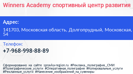 Winners Academy, спортивный центр развития по адресу 141703, Московская область, Долгопрудный, Московская, 54 в дальнейшем Организация, размещена в следующих категориях:
