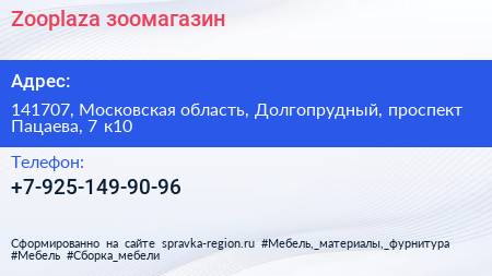 Zooplaza, зоомагазин по адресу 141707, Московская область, Долгопрудный, проспект Пацаева, 7 к10 в дальнейшем Организация, размещена в следующих категориях: