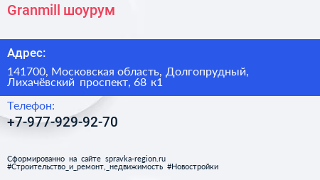 Granmill, шоурум по адресу 141700, Московская область, Долгопрудный, Лихачёвский проспект, 68 к1 в дальнейшем Организация, размещена в следующих категориях: