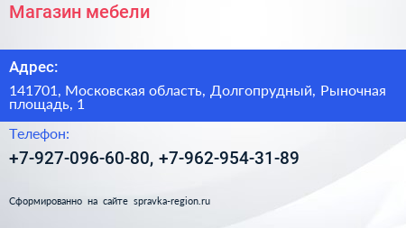 Магазин мебели по адресу 141701, Московская область, Долгопрудный, Рыночная площадь, 1 в дальнейшем Организация, размещена в следующих категориях: