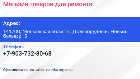 Магазин товаров для ремонта по адресу 141700, Московская область, Долгопрудный, Новый бульвар, 5 в дальнейшем Организация, размещена в следующих категориях: