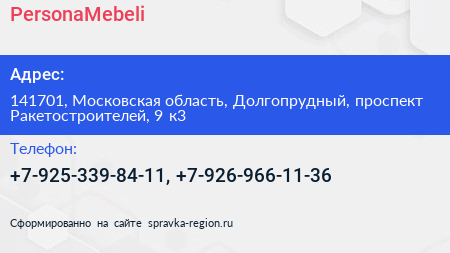 PersonaMebeli по адресу 141701, Московская область, Долгопрудный, проспект Ракетостроителей, 9 к3 в дальнейшем Организация, размещена в следующих категориях: